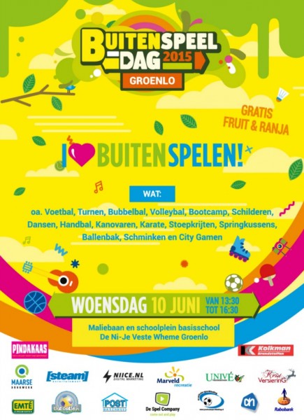 Over 2 weken is het dan zover: de Nationale Buitenspeeldag 2015. Dit jaar wordt het georganiseerd op woensdag 10 juni. We hebben weer een gevarieerd programma samen kunnen stellen dankzij de medewerking van vele verenigingen en vrijwilligers.