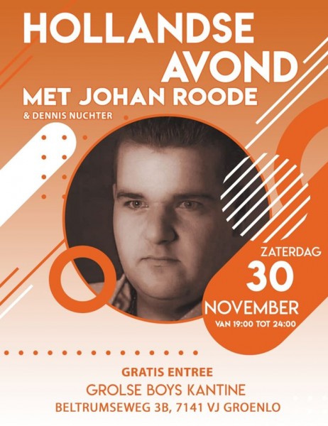 Zaterdag 30 november vindt er in het clubgebouw een Hollandse Avond plaats met medewerking van Johan Roode en Dennis Nuchter. De avond start om 19.00 uur en is om 24.00 uur afgelopen. Toegang gratis.